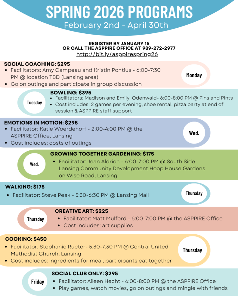 Register now for Spring 2021Danny and Rebecca were the big bingo winners! ASPPIRE will be closed until January 4 for the holidays.Happy Holidays!!! Keep in touch – contact our office for information on our holiday support program.THANK YOU to our 2020 holiday support program sponsors – Meijer W Saginaw, Culver’s W Saginaw, MSUFCU, Potter Park Zoo, The Community Foundation Kurt and Barbara Guter Charitable Fund, Independent Avon consultant Leila Harns, and The Greater Lansing Potters’ Guild, and the many individual donors who made this happen.