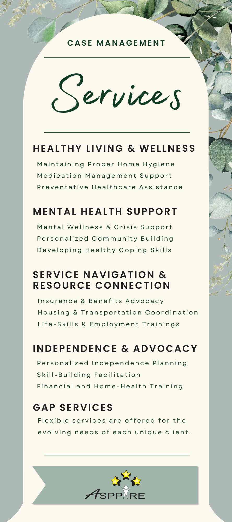 At ASPPIRE of Mid-Michigan, our Case Management services provide personalized, holistic support to help adults with disabilities achieve their goals and thrive. From your first intake meeting to ongoing progress updates, our team works closely with you, your support system, and community resources to create a customized plan that addresses your unique needs. Whether it’s connecting you to services, fostering independence, or guiding you through life transitions, we’re here to ensure lasting success and a clear path forward.